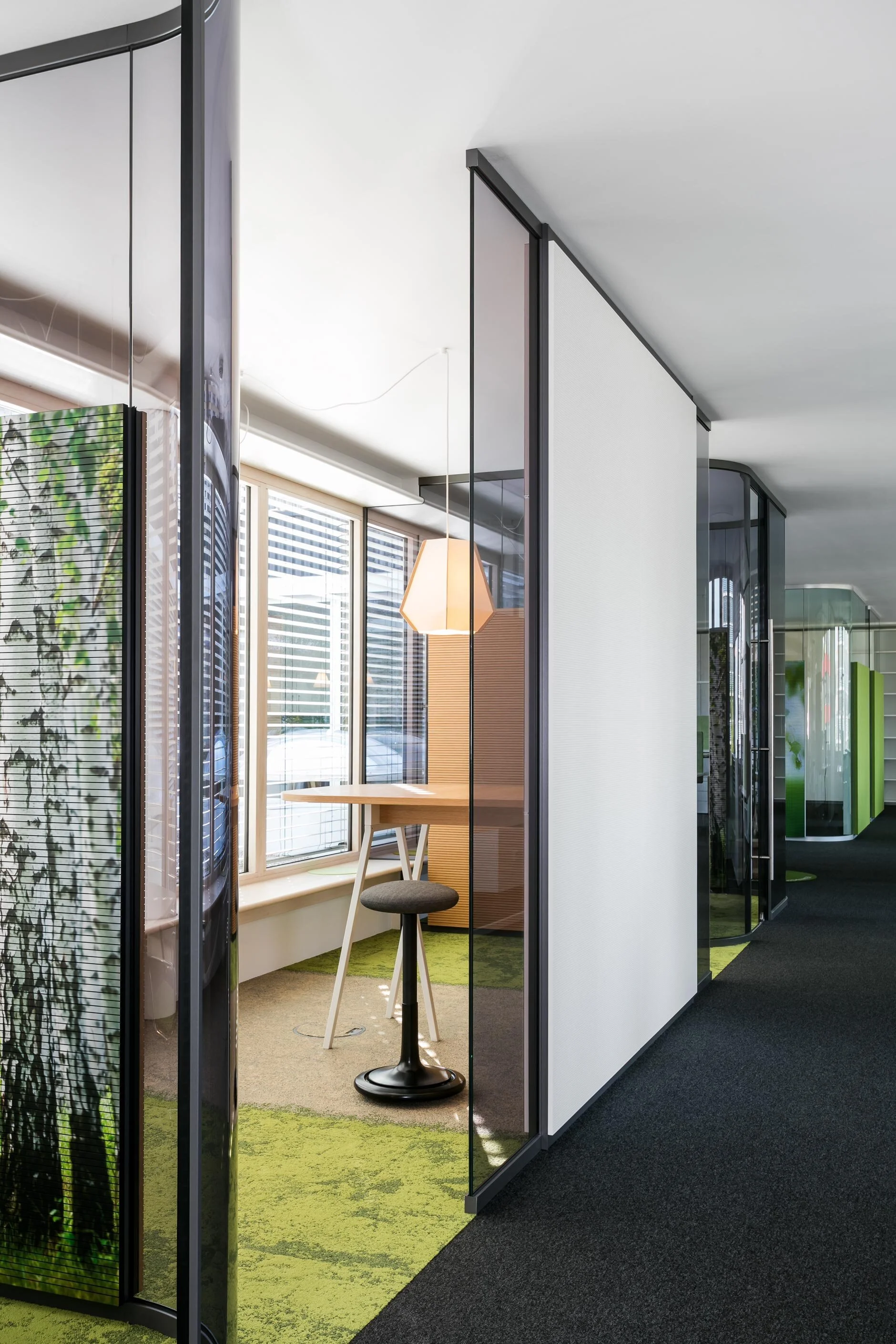 The employees of the System Partition Walls division, previously spread across three buildings, have been brought together in the feco forum. On the second floor, an open communicative office landscape with 38 workplaces has been created on 700 square metres. The working environment has been planned on the basis of the "Office of the Future" concept developed by feco-feederle, which envisages five areas for teamwork, concentration, communication, meeting and inspiration. The team areas enable colleagues to interact with each other. Four think tanks arranged around the inner courtyard can be used for concentrated work. Communication takes place in the standing meeting zones, while meeting rooms are available for scheduled meetings. Inspiration zones round off the concept.